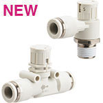 Low speed type speed controller with quick fitting. Provides easy speed control of low-speed specification air cylinders.
